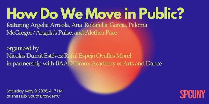 This second program in the series is partnered with BAAD! Bronx Academy of Arts and Dance during the Boogie Down Dance Series. Organized by Nicolás Dumit Estévez Raful Espejo Ovalles Morel, this event brings together dancers/choreographers with connections to the Bronx to generate movement-based actions in public spaces in the South Bronx: Argelia Arreola (with support from Pepatián: Bronx Arts ColLABorative), Ana ‘Rokafella’ García, Paloma McGregor/Angela’s Pulse, and Alethea Pace. Responding to escalating surveillance, policing, and state violence, particularly the terrorization of Black and Brown communities under ongoing ICE raids, the program advances movement as a counter-response to neglect, with care, and shared imagination, asking how bodies navigate, reshape, and reclaim urban space under conditions of threat. This program will activate several points along 3rd Avenue and 149th Street, a major cultural crossroads at the heart of the South Bronx called The Hub.